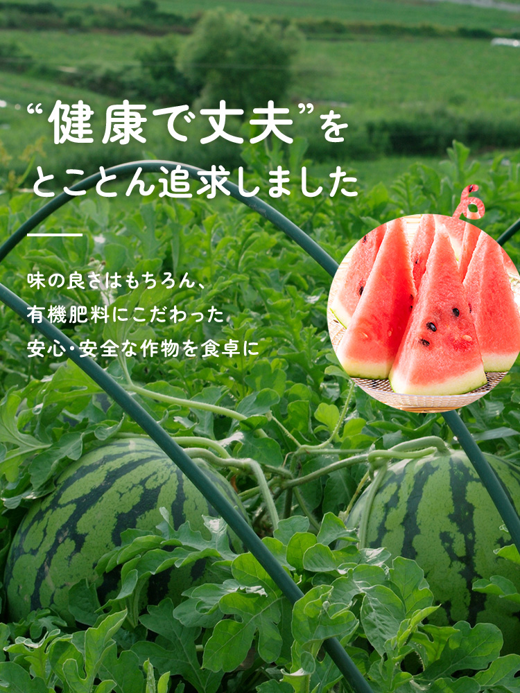 農薬はなるべく使わず、家族みんなで安心して食べられる作物です。とくにスイカは糖度にもこだわって栽培と販売をしております。